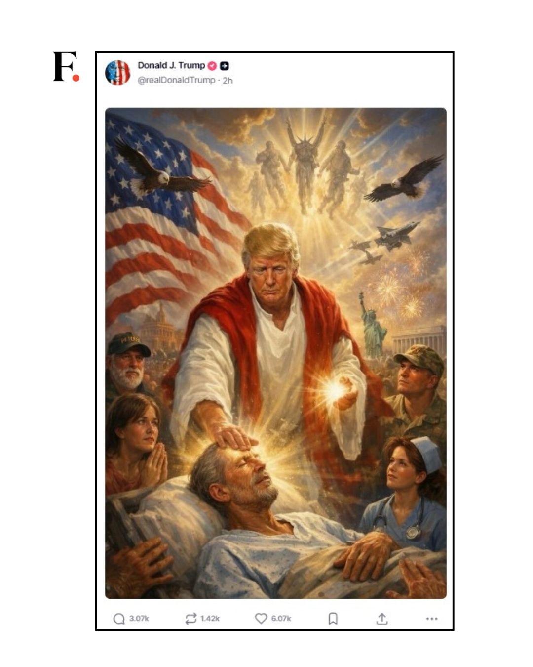 Trump surge agora em imagem criada por IA e por ele próprio divulgada, de túnica, personificando Jesus Cristo, a curar doentes, rodeado de soldados e com a bandeira norte-americana por trás, com águias e aviões de guerra por cima da sua cabeça, numa epifania de guerra benfazeja e milagrosa – o que quer que isso seja.