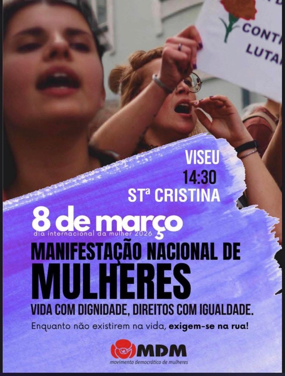 Inserido nas comemorações do Dia Internacional da Mulher, 8 de Março, e enquadrado pela Manifestação Nacional de Mulheres convocada pelo Movimento Democrático de Mulheres (MDM), o Núcleo de Viseu do MDM, organizará nesse mesmo dia, às 14h30m, um desfile entre o Largo de Santa Cristina e a Praça da República “Rossio”, com concentração no final, momento cultural e intervenções.