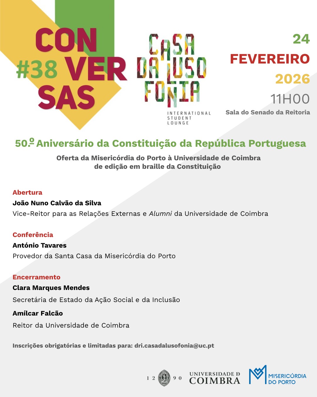 A Universidade de Coimbra (UC) promove, na terça-feira, dia 24, a partir das 11h00, a 38.ª sessão das “Conversas da Casa da Lusofonia”, em comemoração do 50.º aniversário da Constituição da República Portuguesa (1976), com uma conferência do Provedor da Santa Casa da Misericórdia do Porto, António Tavares, instituição que, nesta ocasião, oferecerá à UC uma edição em braille da Constituição.