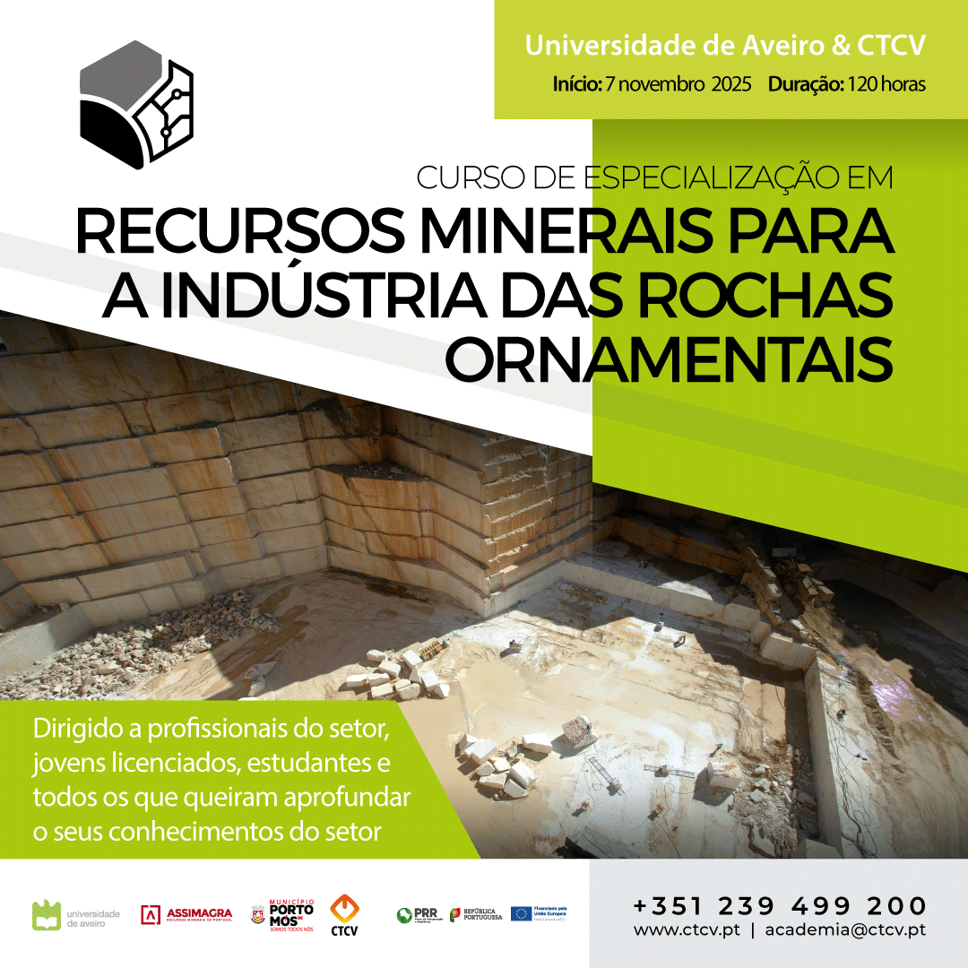 O Departamento de Geociências da Universidade de Aveiro (DGeo) e o CTCV, tem abertas, até 9 de outubro, as candidaturas para o Curso de Especialização em Recursos Minerais para a Indústria das Rochas Ornamentais.