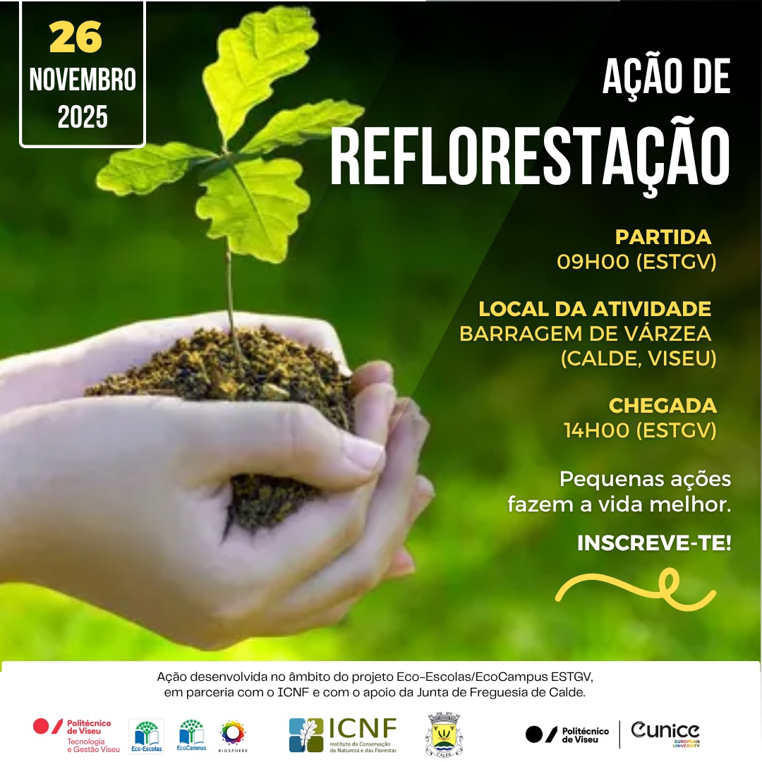 No âmbito do seu compromisso com o desenvolvimento sustentável, a Escola Superior de Tecnologia e Gestão de Viseu (ESTGV) promove, no próximo dia 26 de novembro de 2025, uma Ação de Reflorestação junto à Barragem de Várzea de Calde (Viseu).