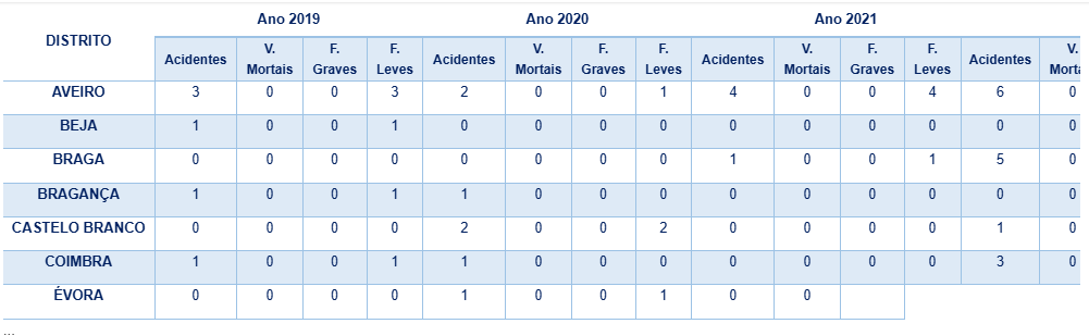 A distribuição por distritos revela que Aveiro e Faro apresentam o maior volume de sinistralidade e de feridos (graves e leves). Contudo, é o distrito de Setúbal que regista o maior número de vítimas mortais (3 óbitos) no período em análise. Destaca-se ainda o distrito de Santarém, com um registo de 14 feridos graves nos últimos 7 anos.