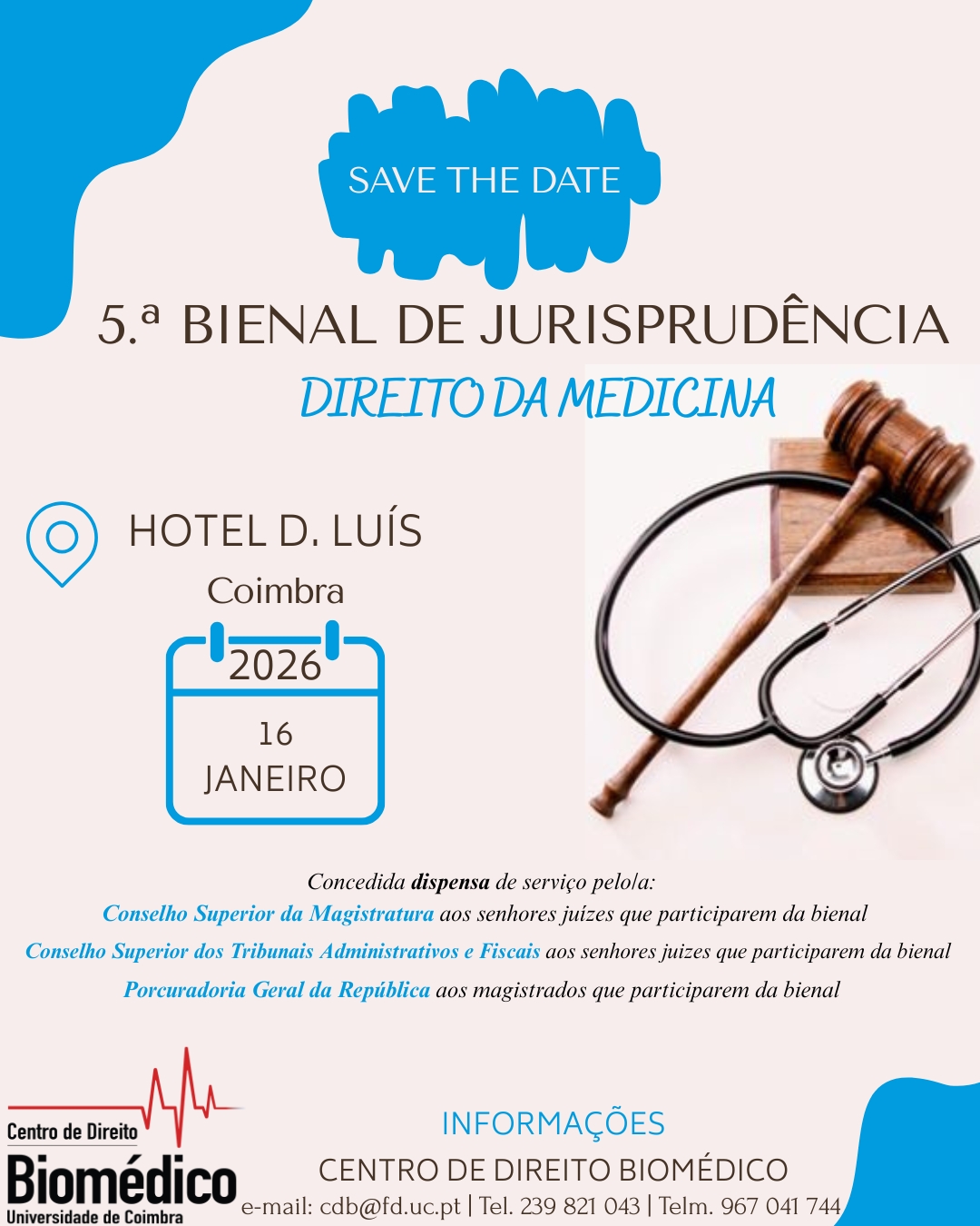 A Universidade de Coimbra (UC) promove na sexta-feira, dia 16, a 5.ª Bienal de Jurisprudência em Direito da Medicina. O encontro científico, organizado pelo Centro de Direito Biomédico da Faculdade de Direito da UC, pelo Centro de Estudos Judiciários e pela Ordem dos Advogados, decorre no Hotel D. Luís (Coimbra), entre as 9h15 e as 18h30.